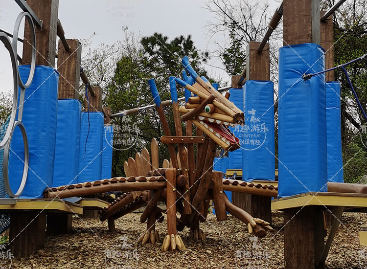 翼龍樂園區(qū)是利用客戶場地上原有的立柱,充分將廢棄的場地再度利用,讓已經(jīng)荒廢的場地重裝上陣,成為一個為用戶帶來快樂的新場地,我們在陳舊的立柱與立柱之間設(shè)計了各種造型的趣橋項目,同時打造生動好玩的翼龍攀爬作為連接橋,讓我們的項目好玩又好看。